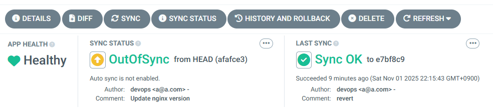 - 이후 ops-deploy Repo 에 git push ⇒ Argo CD App Trigger 후 AutoSync 로 신규 버전 업데이트 진행