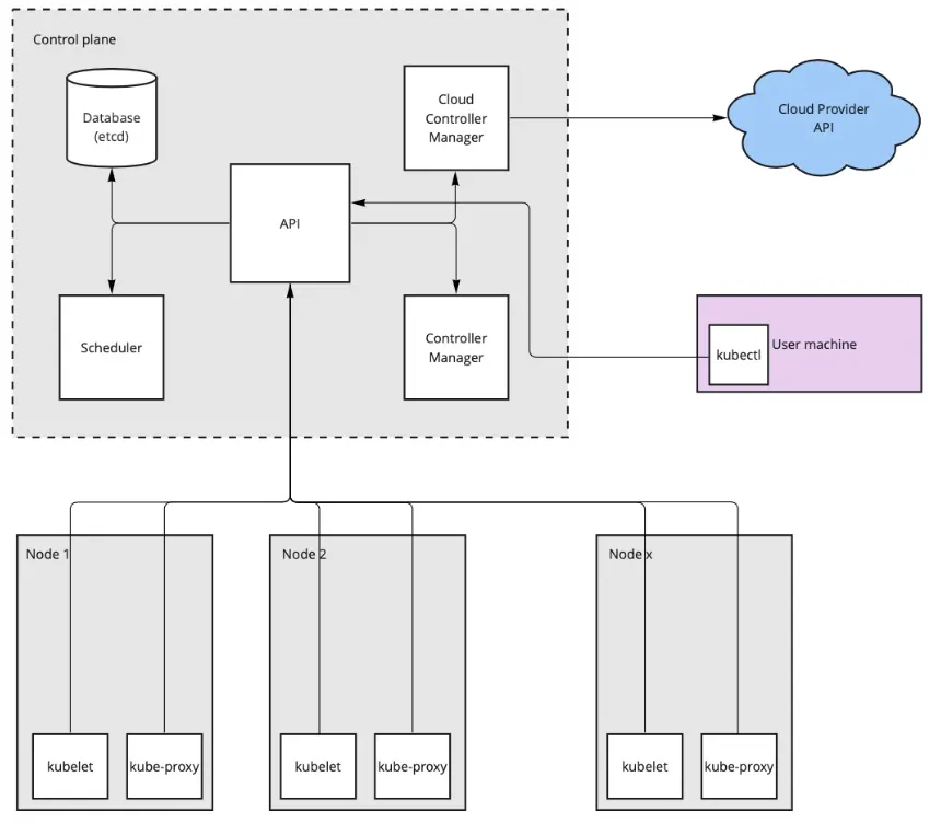 - 컨트롤 플레인은 REST API 서버와 데이터베이스 etcd, 다중 컨트롤 루프 multiple control loops 를 사용하는 컨트롤러 매니저, 노드에 파드를 할당하는 스케줄러로 구성된다.