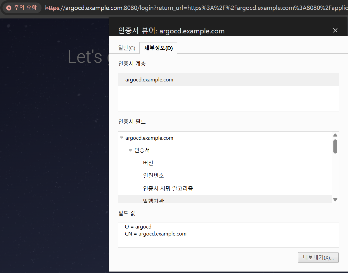 - 해당 설정이 안될 경우 보통 ‘argocd.example.com에서 리디렉션한 횟수가 너무 많습니다.’ 발생.